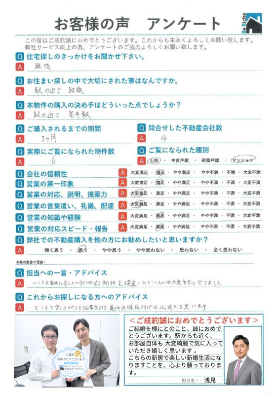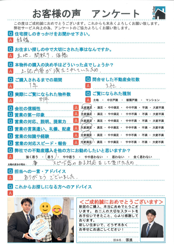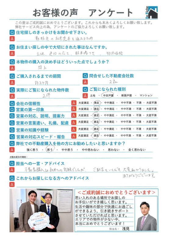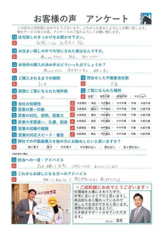 【担当コメント】 この度は不動産売却をおまかせ頂きありがとうございました。 上記アンケートの「満足」を今後は「大変満足」と思って頂ける様精進して参ります。 ぜひ今後とも何卒よろしくお願い致します。