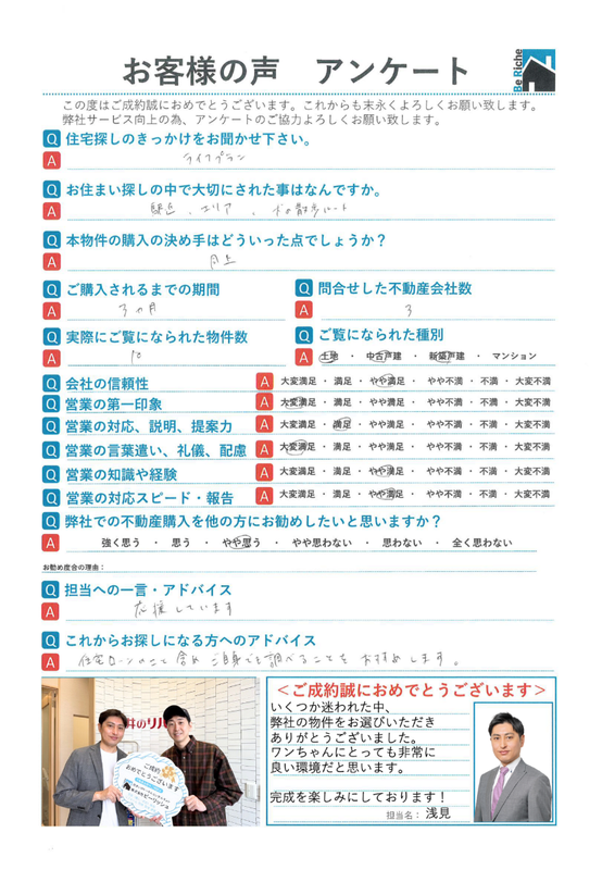これまでご成約させて頂きましたお客様にアンケートにご協力頂いております。 株式会社ビーリッシュで契約してみてどうだったか、不動産を決める時のポイント、等実際の生の声を集めさせて頂きました。