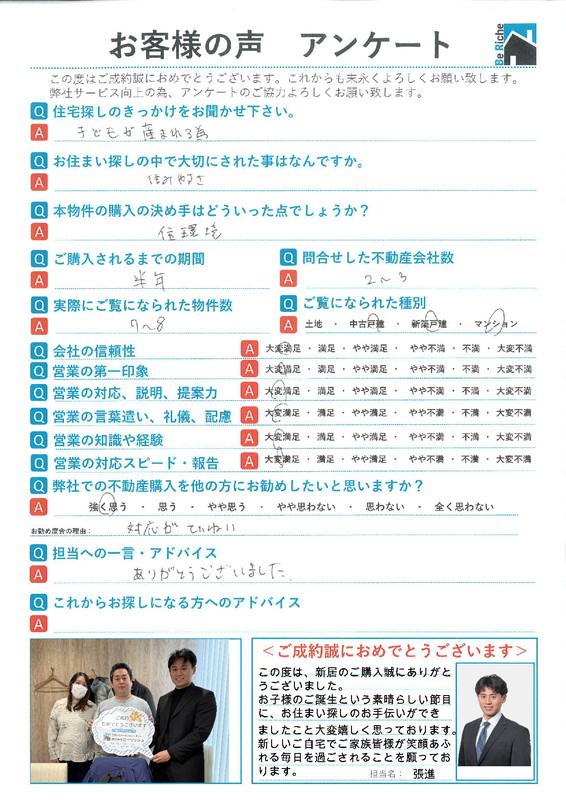 【担当コメント】 この度は、新居のご購入誠にありがとうございました。 お子様のご誕生という素晴らしい節目に、お住まい探しのお手伝いができましたこと大変嬉しくおっております。 新しいご自宅でご家族皆様が笑顔あふれる毎日を過ごされることを願っております。 担当名: 張進