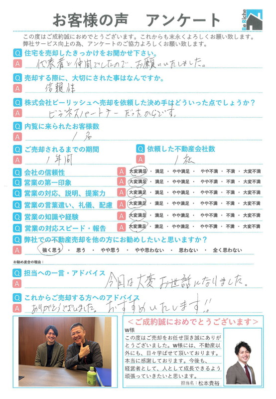 【担当コメント】 この度はご売却をお任せ頂き誠にありがとうございました。W様には、不動産以外にも、日々学ばせて頂いております。本当に感謝しております。今後も、経営者として、人として成長できるよう頑張っていきたいと思います。 担当名: 松本貴裕